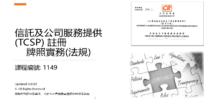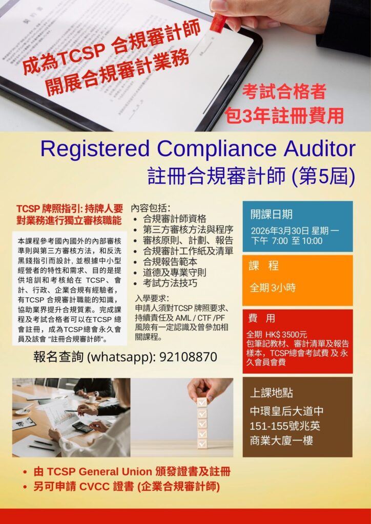 - TCSP “註冊合規審計師” 的註冊 (培訓費已包括以下)