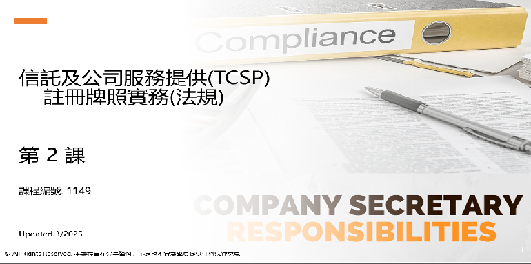 課程內容包括:(1) 信託及公司服務提供者(TCSP)註冊牌照相關概和相關的法例、規則的來源和框架;(2) 從事提供公司秘書服務和商務行政服務的法規範圍;(3) 法規中要求的一些角色例如董事、秘書、指定人、合規主任等等,的職務和責任;(4) 客戶盡職審查、反洗黑錢指引;(5) 私人公司秘書服務:成立業務、持續合規要求、法定登記冊、結束業務等等的原理和方法。